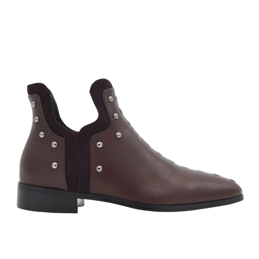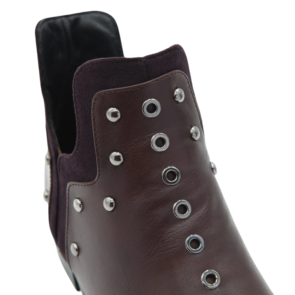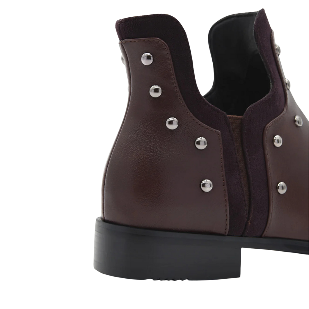 Botín de tendencia en color marrón chocolate ideal para tu día a día y tus looks más cañeros con ese detalle de las tachas en plateado. Un diseño cómodo, chic y muy favorecedor para looks casuales. Tacón de 3,5cm y plantilla de piel de gel especial confort.