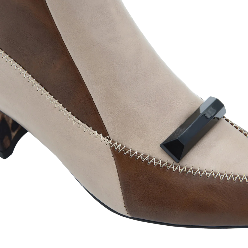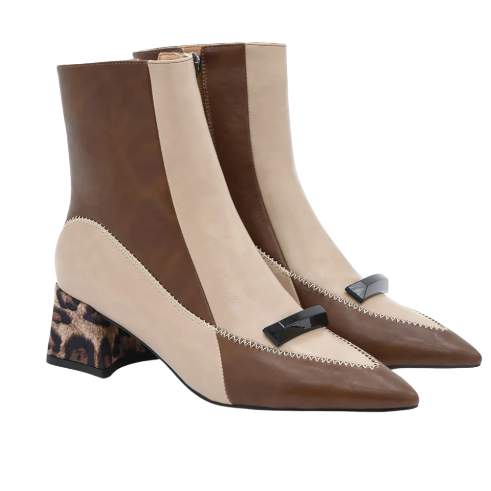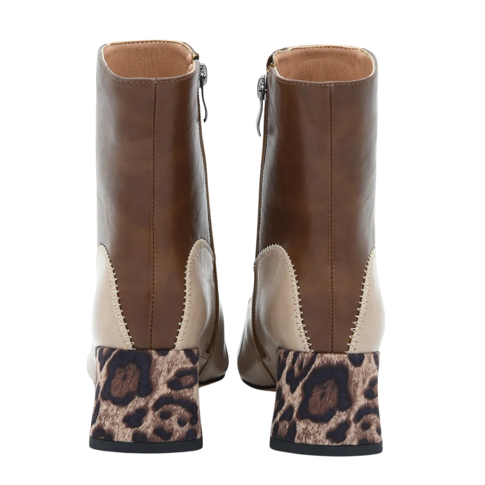 Botin en color taupe y marrón con detalle en la parte delantera y tacón ancho de 5cm estampado en leopardo. Un diseño perfecto para tu dia a dia y también para darle un toque diferente a tus looks de fin de semana. Lleva cremallera a un lado y plantilla de piel en gel especial confort.