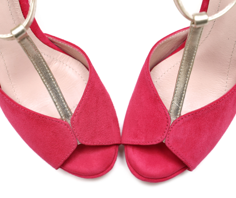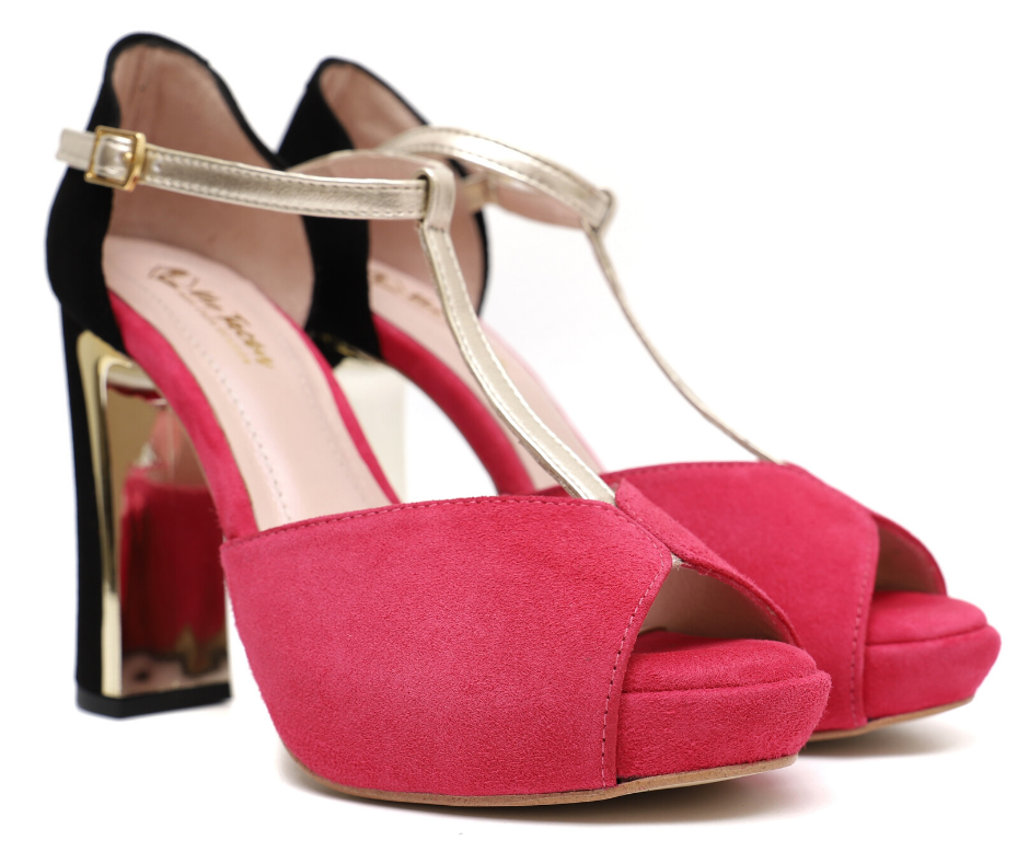 Sandalia de piel, en ante fucsia y negro con tacón de 11cm ancho y plataforma de 3,5cm. Un precioso diseño con detalles dorados ideal para tus looks de noche más veraniegos.