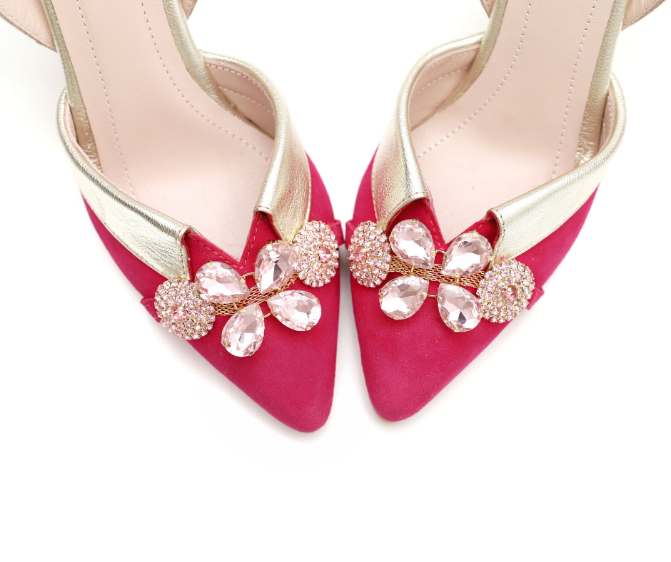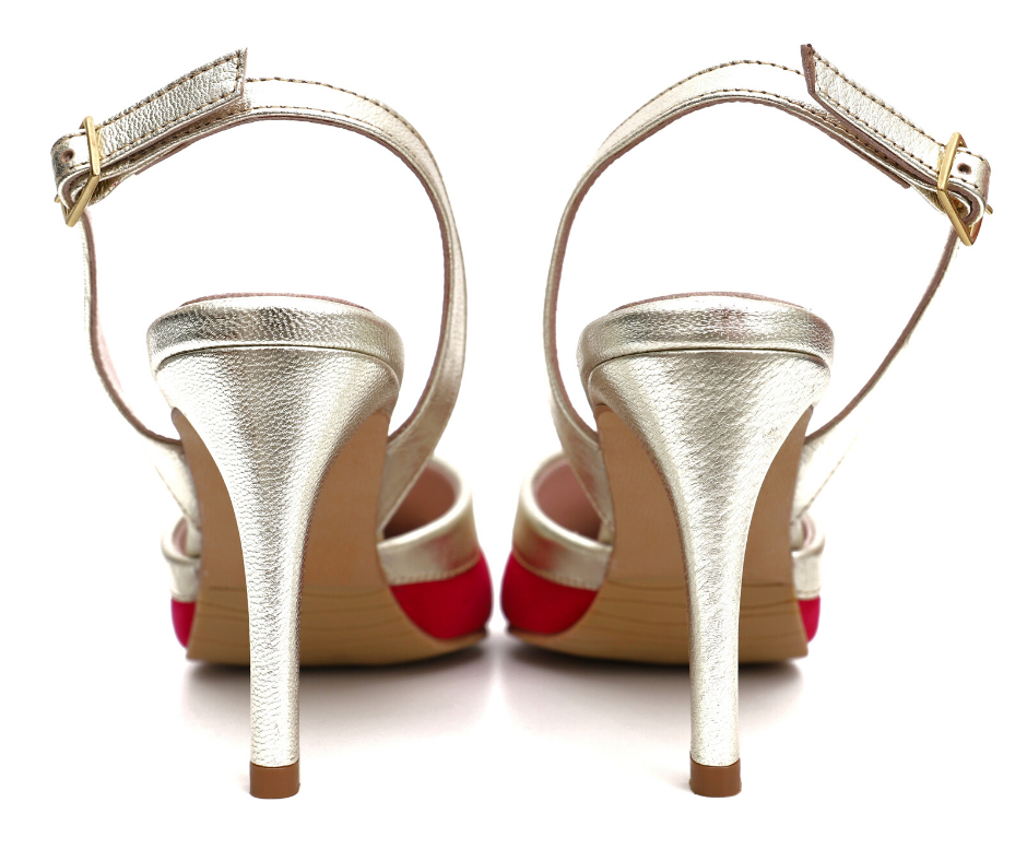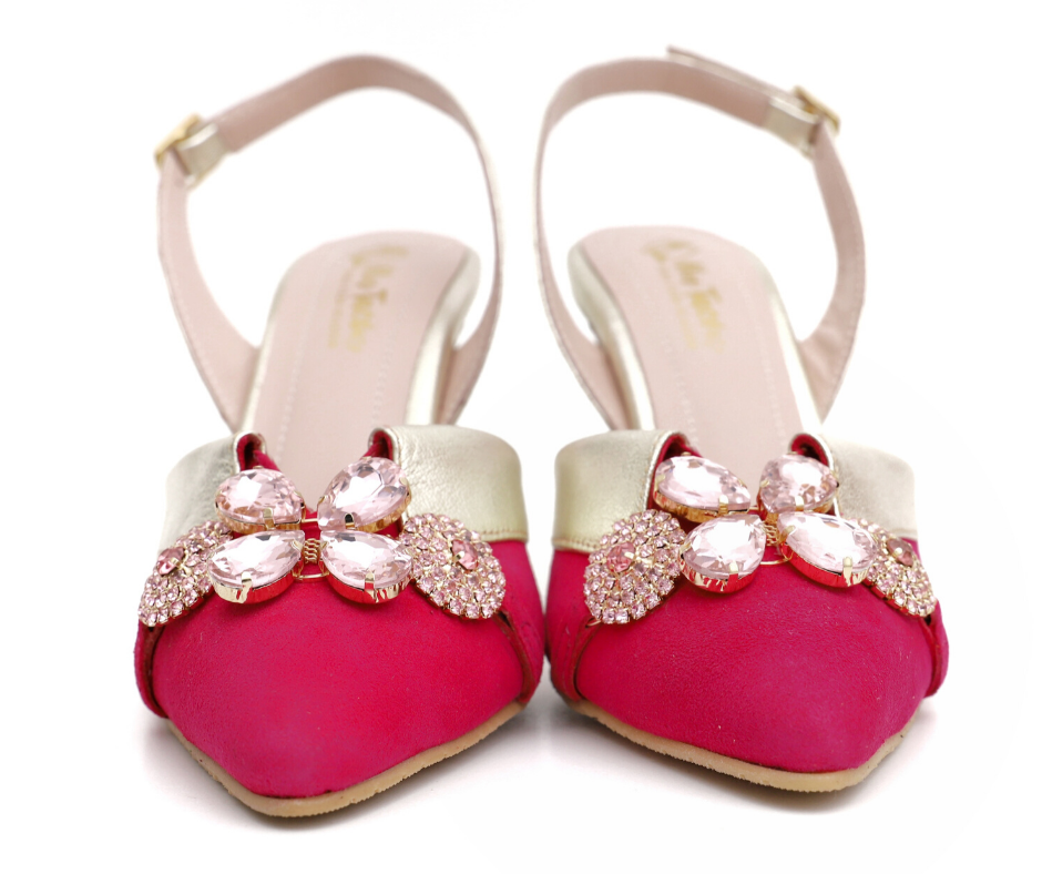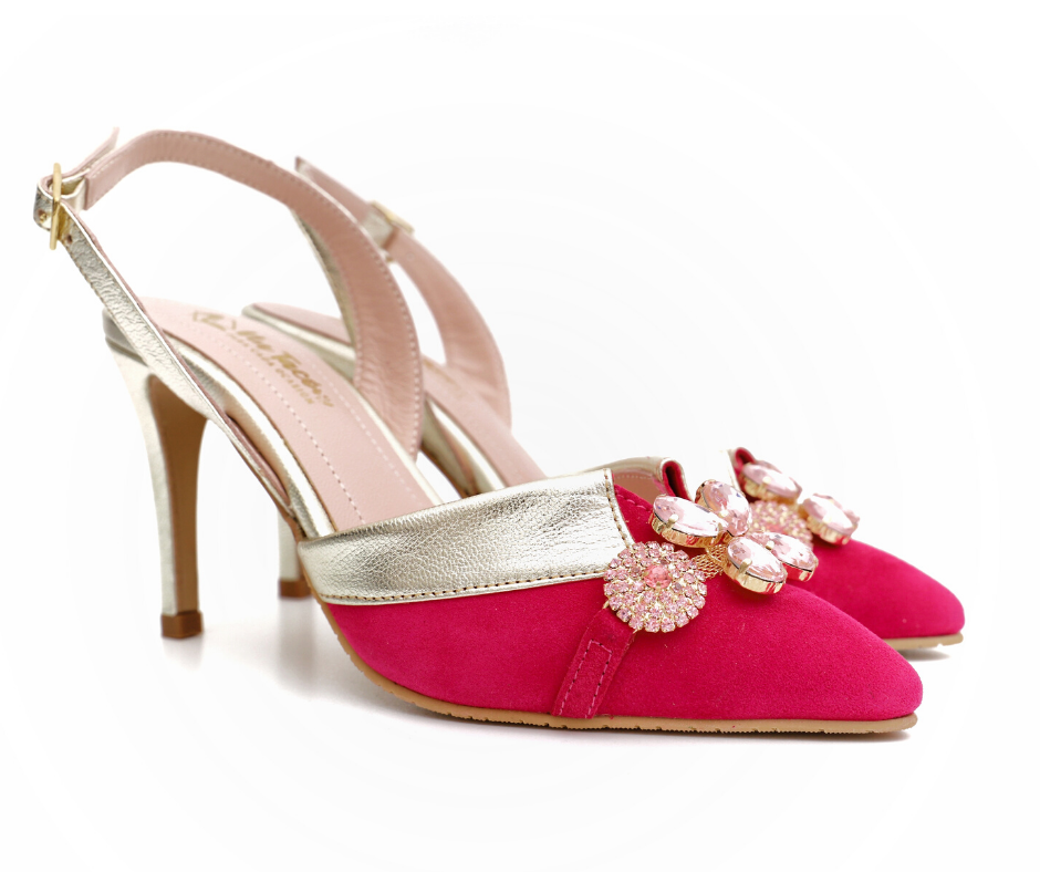 Salón de piel en ante fucsia con detalle de pedrería en tonos rosa. Un diseño super original destalonado combinado en piel dorado con tacón de 8cm, plantilla de gel confort y perfecto para ser una invitada de 10 esta temporada.