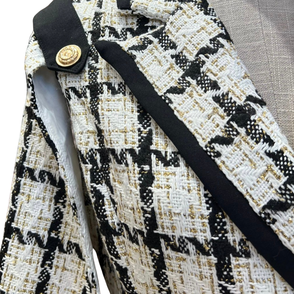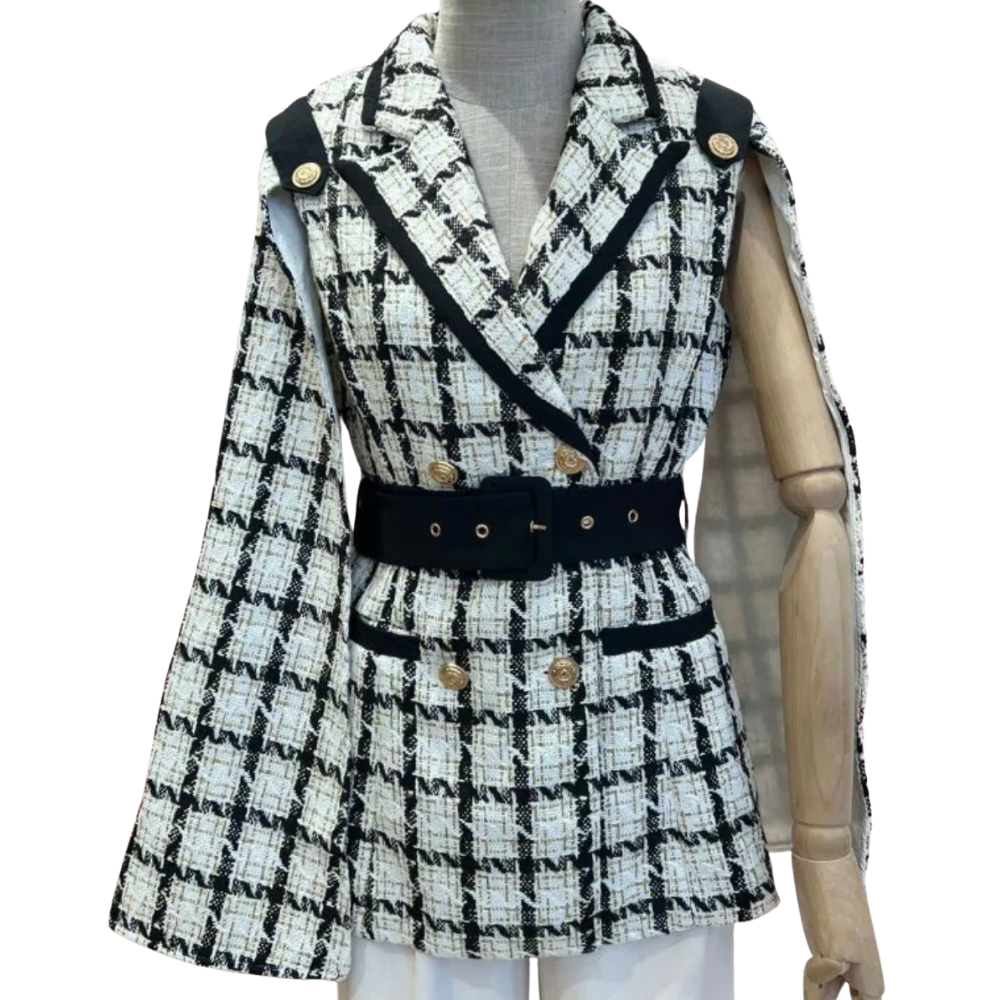 Blazer tipo capa con aberturas en los brazos y cinturón negro ajustable. El diseño más "Chanel" de la temporada ha llegado para elevar tus looks con ese toque chic parisino irresistible. Color blanco y negro con detalles dorados.