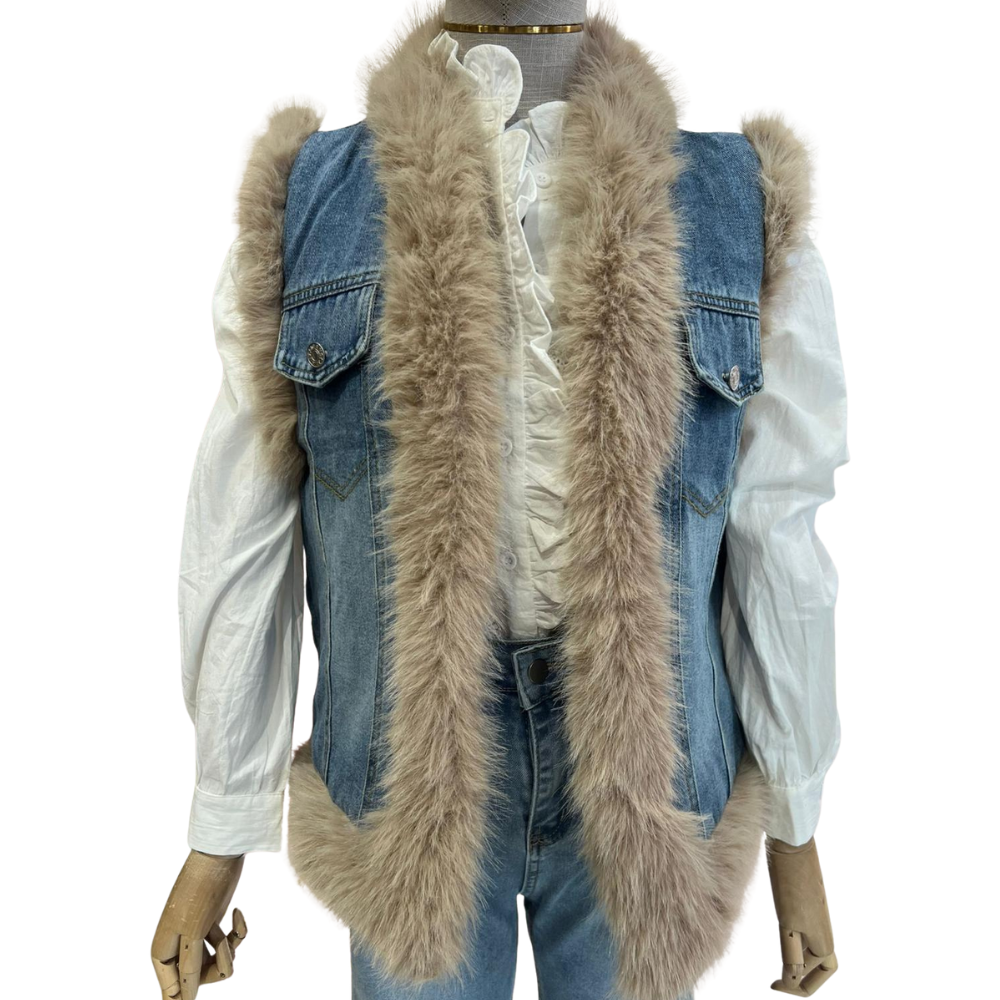 Chaleco en tejido denim con pelitos, con bolsillos y super combinable para tus looks de diario y también para darle un toque chic a tus look más arreglados. Lleva forrito por dentro.