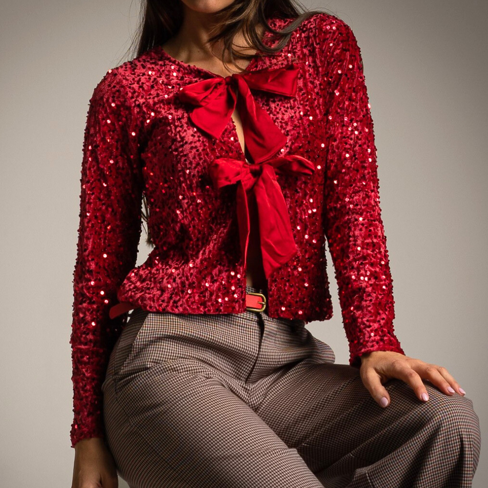 Chaquetilla de terciopelo con lentejuelas y detalle de lacitos en el escote. Un diseño original y perfecto para tus looks de fiesta más arreglados.