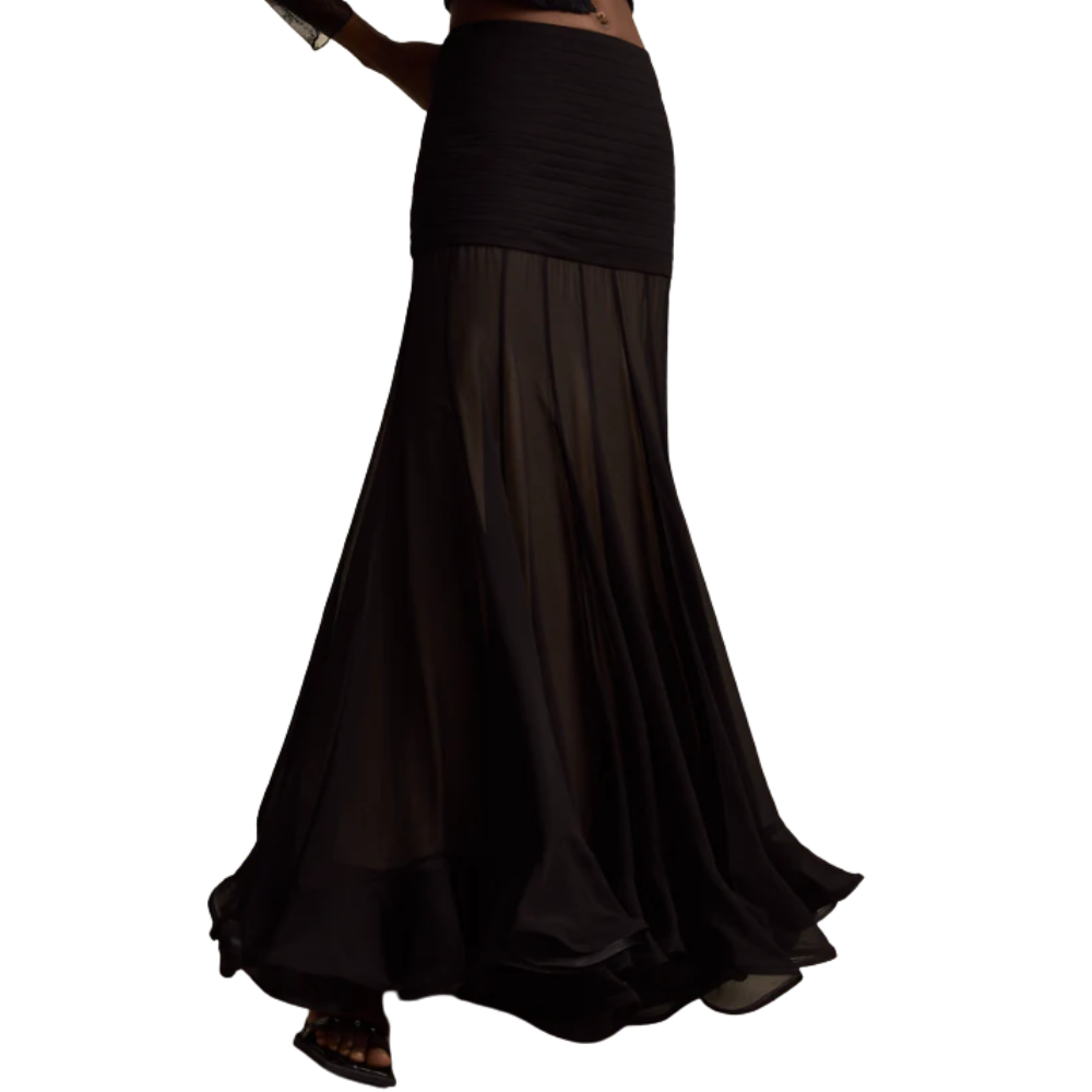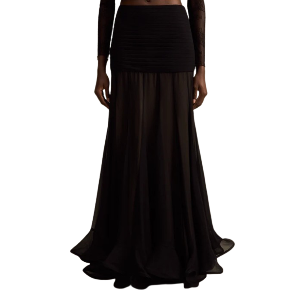 Falda larga negra con cinturilla elástica plisada. En la parde de abajo lleva unos pequeños volantes que le dan un vuelo precioso y además tiene forro interior hasta abajo. Todo un acierto si quieres conseguir un look elegante y sofisticado de noche.