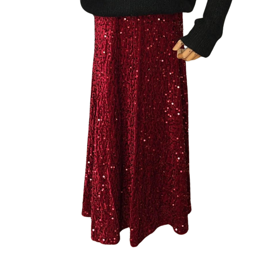 Falda de terciopelo con lentejuelas en color burdeos. Tiene cinturilla elástica y cremallera en la parte trasera. Lleva forro interior y tiene un brillo precioso. Color: burdeos Talla única desde una 36 a una 42.