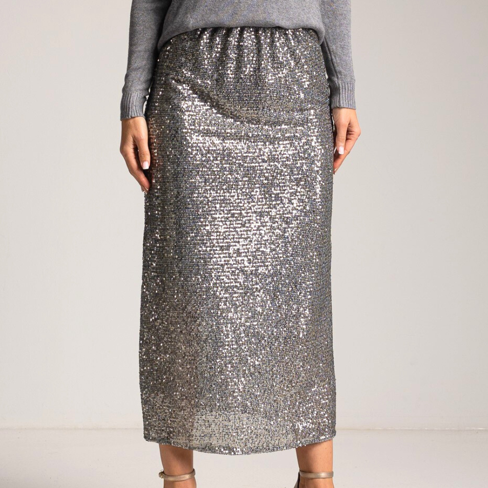 Falda de lentejuelas plateada al bies. El diseño perfecto para darle un toque glamuroso a tus looks estas fiestas. Elástica en la cintura y corte midi. Color: plata Fabricado en Italia Guía de tallas:
