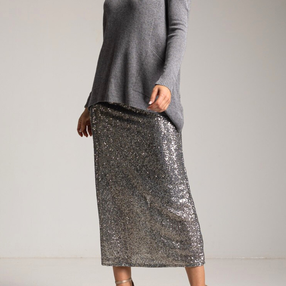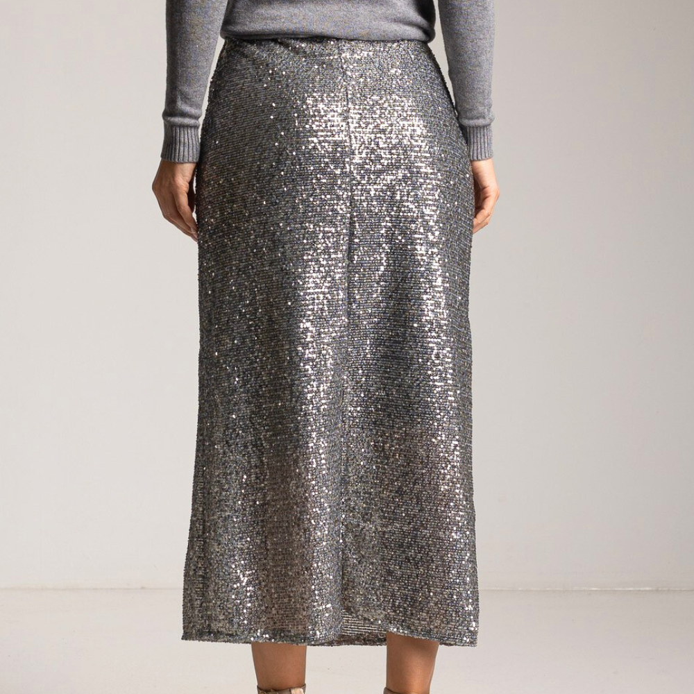Falda de lentejuelas plateada al bies. El diseño perfecto para darle un toque glamuroso a tus looks estas fiestas. Elástica en la cintura y corte midi.
