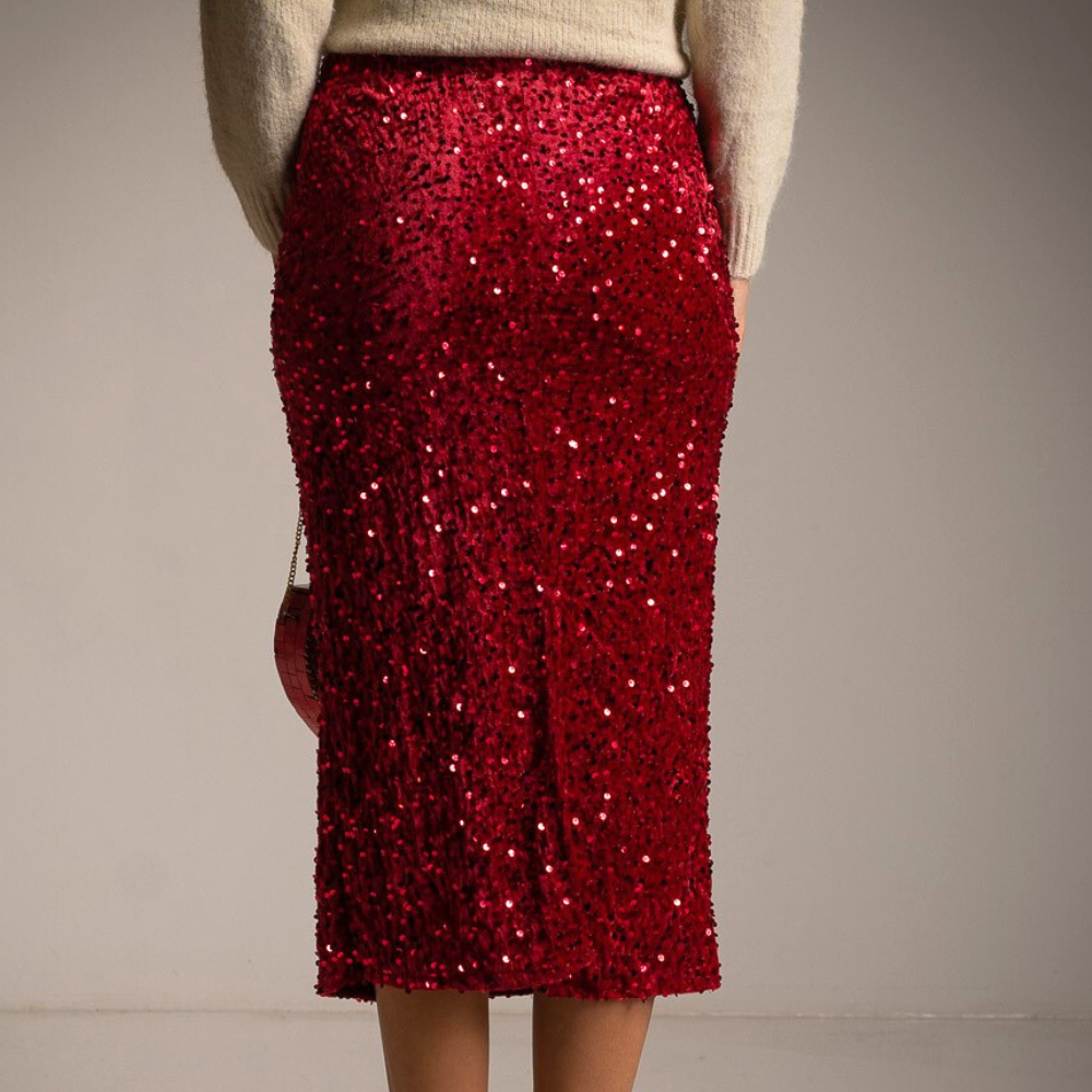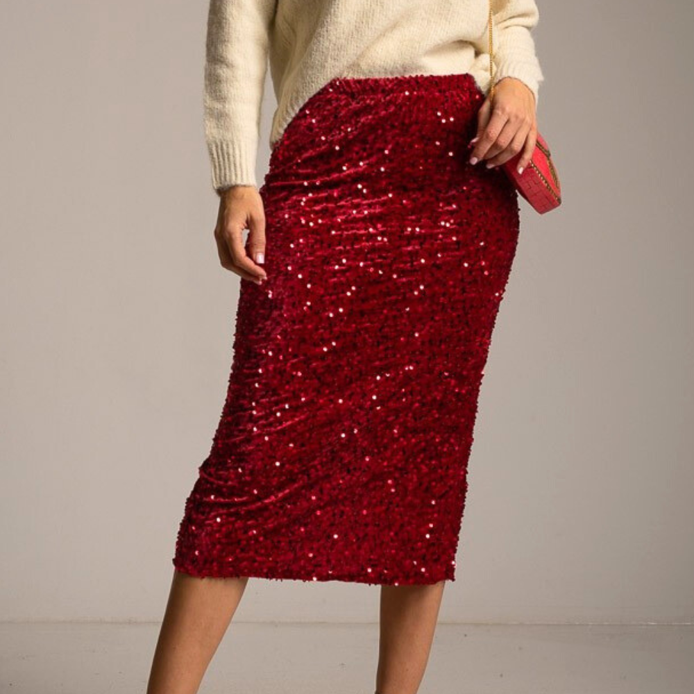 Falda terciopelo con lentejuelas color burdeos tipo tubo. Cintura elástica para mayor comodidad en tus dias o noches de fiesta.