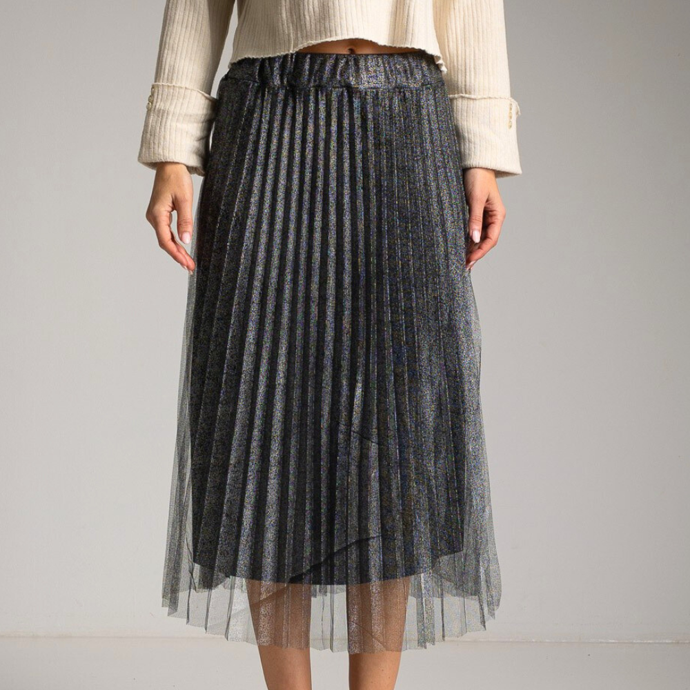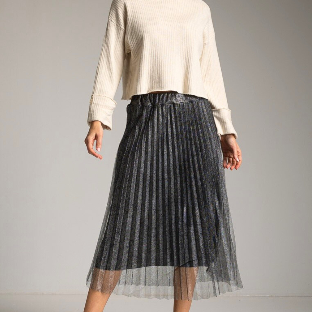 Falda de tul plisada en tono gris plomo con brillitos plateados. Un diseño elegante y perfecto para tus dias de fiesta. Cintura elástica.