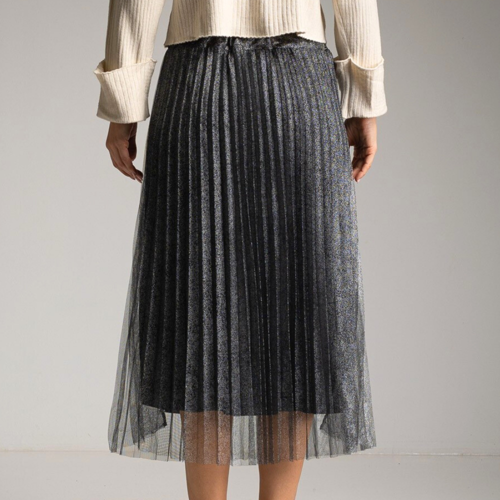 Falda de tul plisada en tono gris plomo con brillitos plateados. Un diseño elegante y perfecto para tus dias de fiesta. Cintura elástica. Color: gris Fabricado en Italia Guía de tallas: