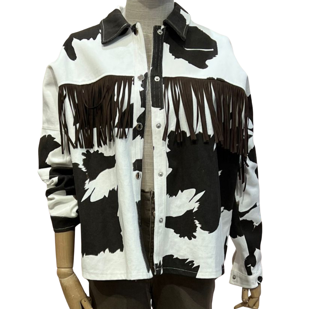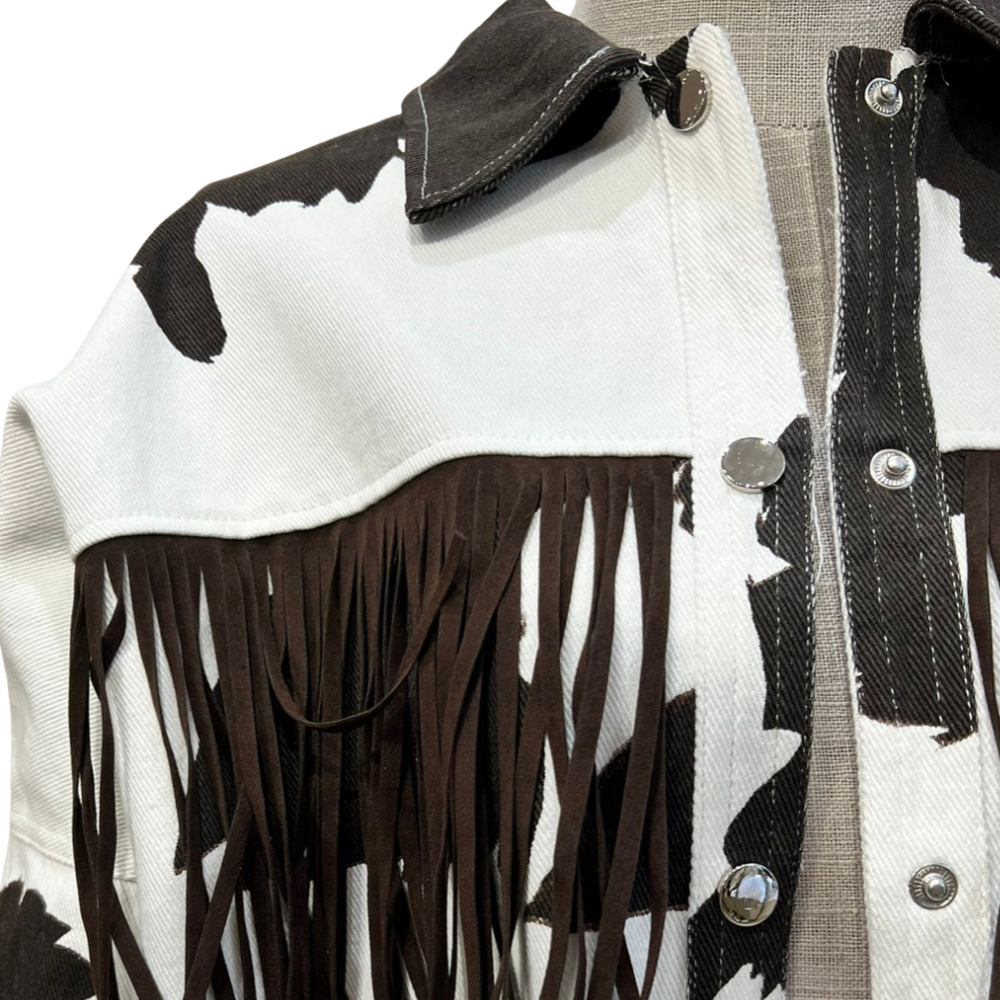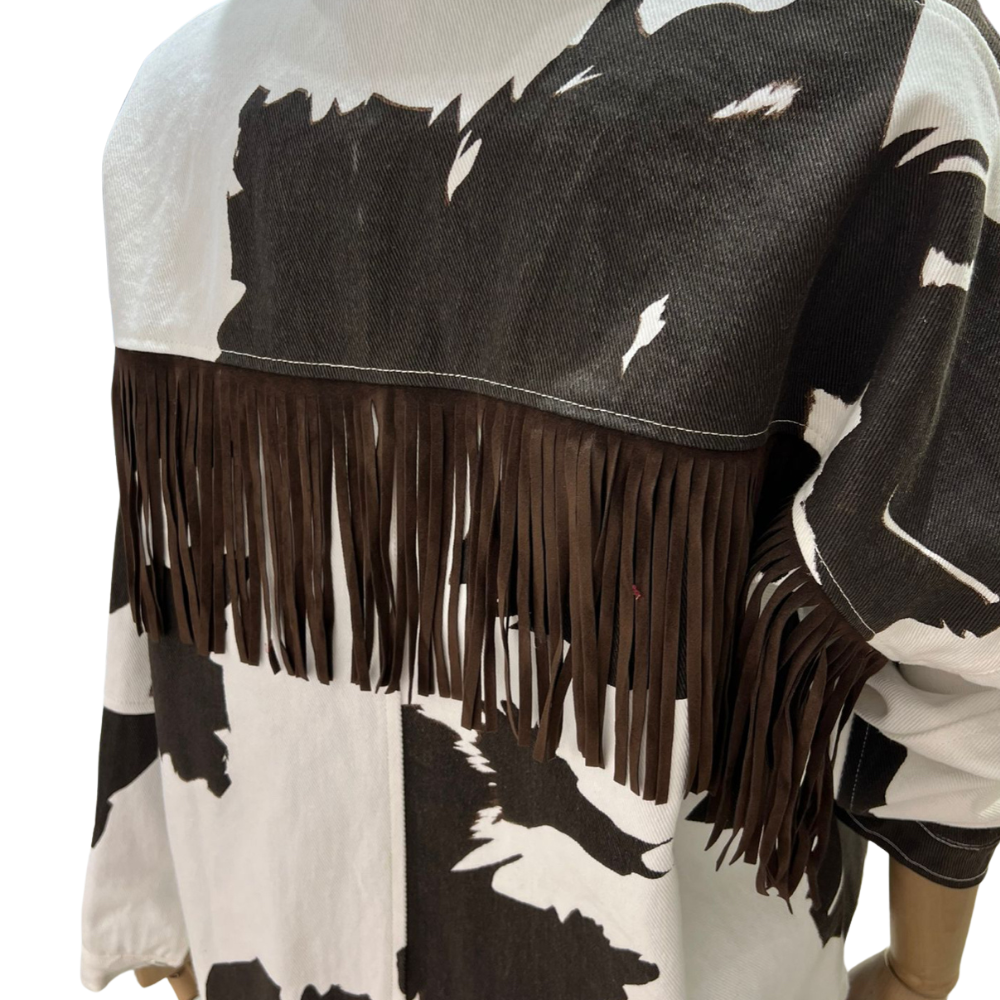 Sobre camisa denim con estampado VACA, el print más deseado esta temporada. Detalle de flequitos estilo "cowboy" y con bolsillos. Un diseño super original que no puedes dejar escapar este Otoño.