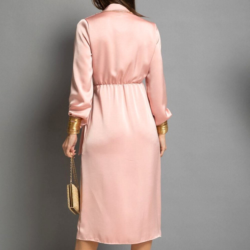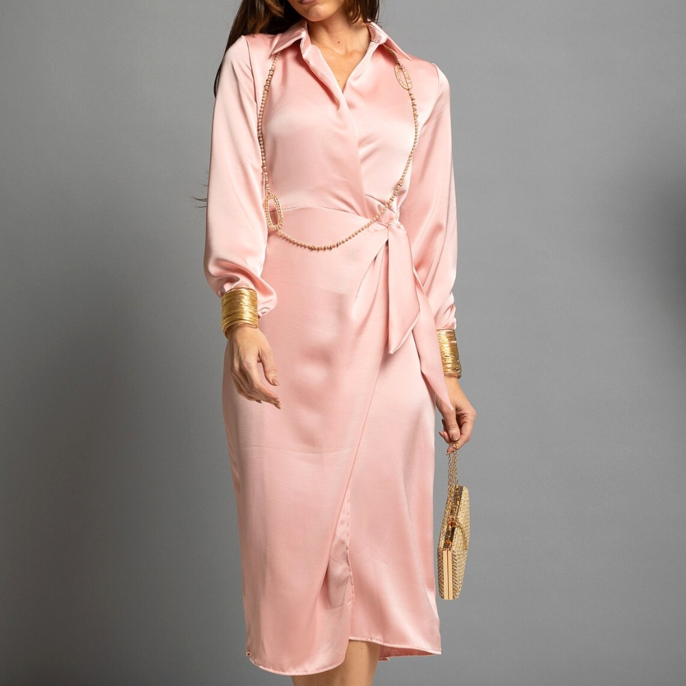 Vestido satinado en color rosa corte midi con manguita larga y puño cerrado. En la cintura lleva un pequeño fruncido y es cruzado para que estilice la figura. Tiene elástico en la cinturilla trasera y da talla hasta una 44.