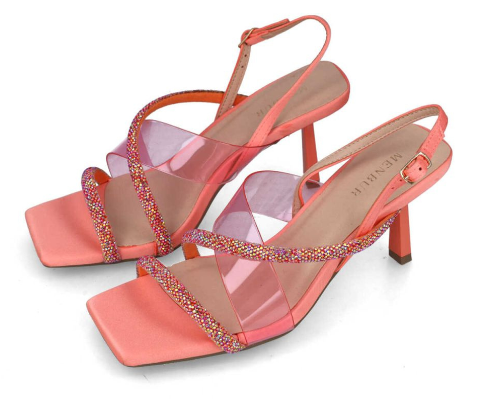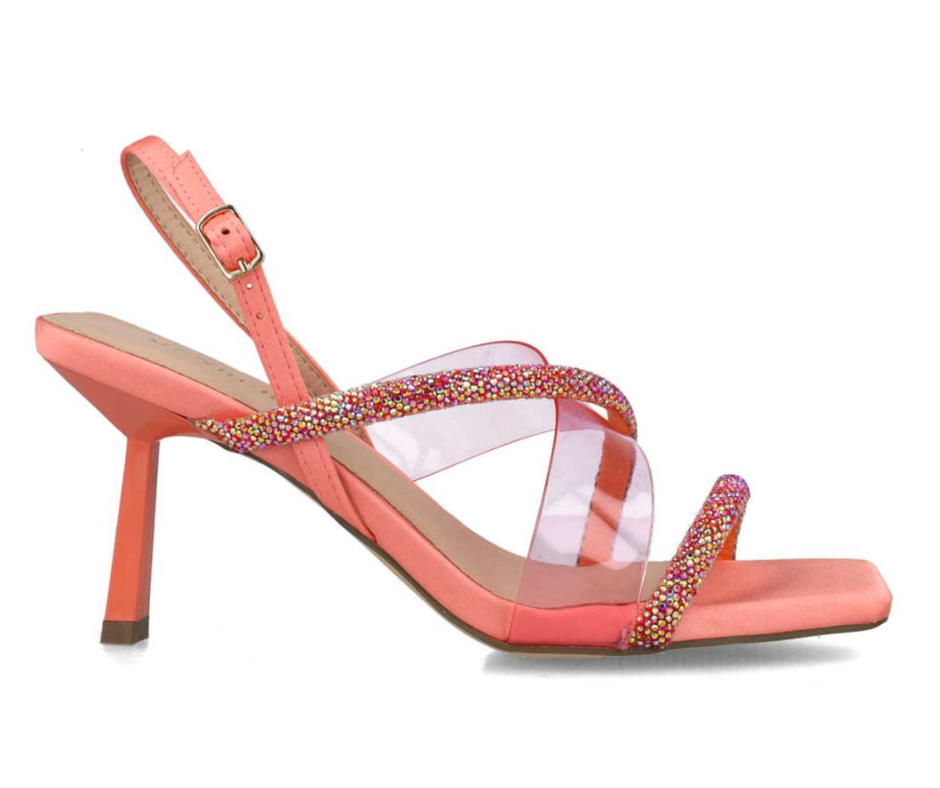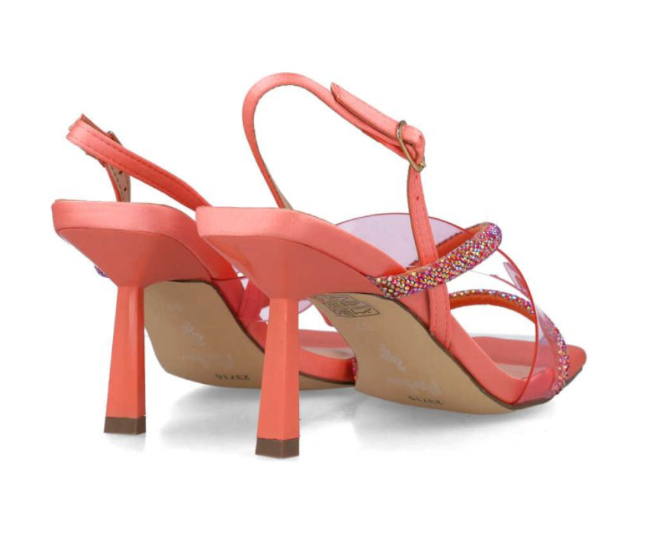 Sandalia joya en tono salmón anaranjado de raso con detalle de tiras de pedrería y vinilo, tacón de 8cm y plantilla de gel especial confort. Un diseño elegante, femenino y perfecto para ser la invitada ideal en tus próximos eventos esta temporada.