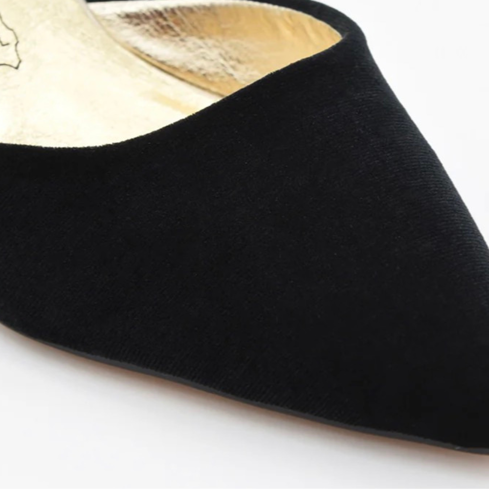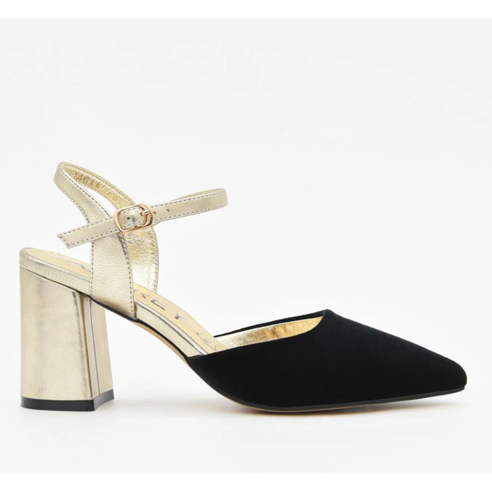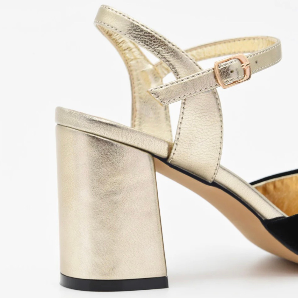 Zapato de terciopelo negro con tacón ancho dorado, un diseño que ofrece una mezcla perfecta entre comodidad y estilo refinado, con una planta de piel acolchada que asegura una comodidad delicada desde el primer paso. El contraste del terciopelo negro sofisticado con el tacón metálico dorado aporta ese toque de distinción ideal tanto para eventos como para vienes con aire elegante. El tacón ancho de 7cm refuerza la estabilidad sin perder estilo, listo para acompañarte con confianza.