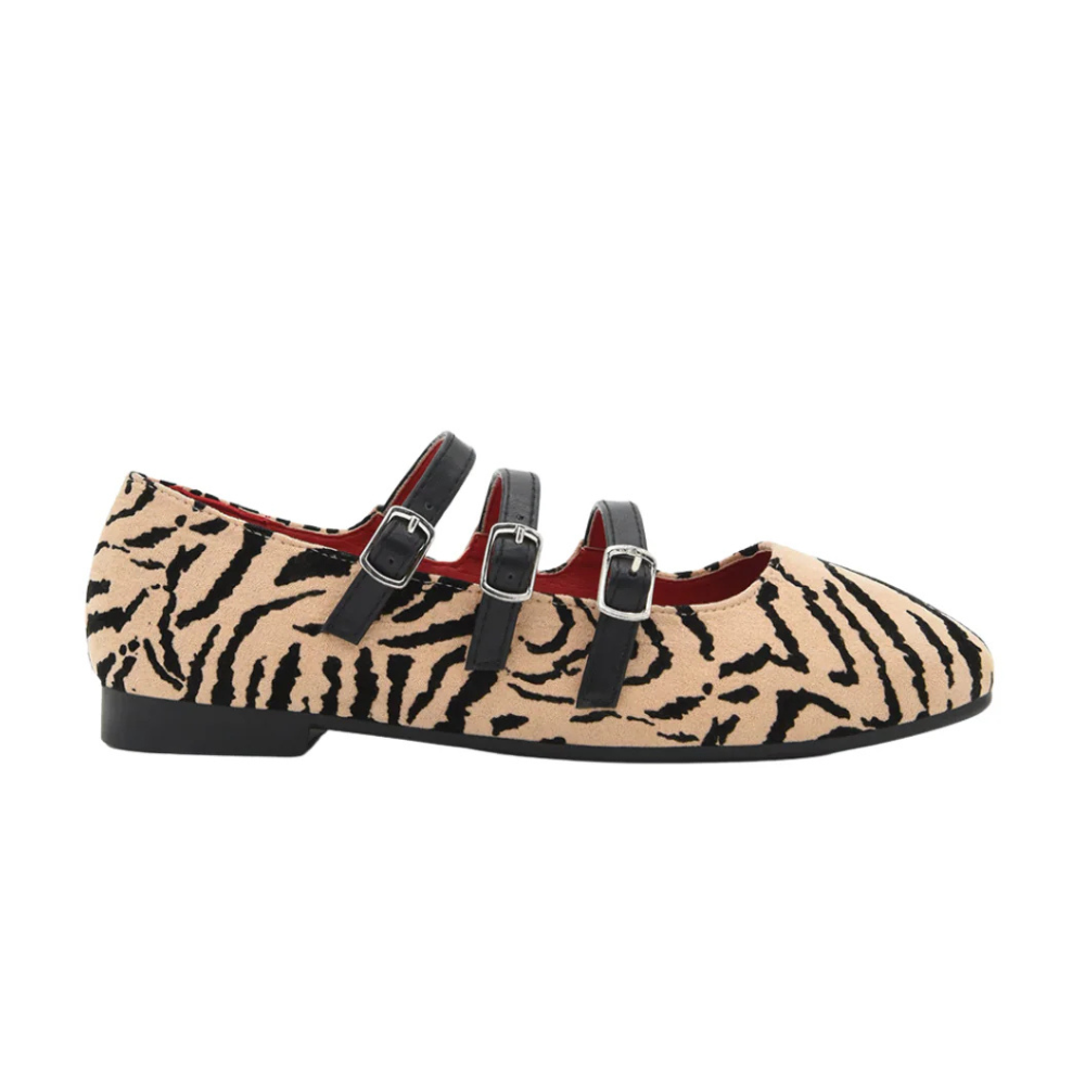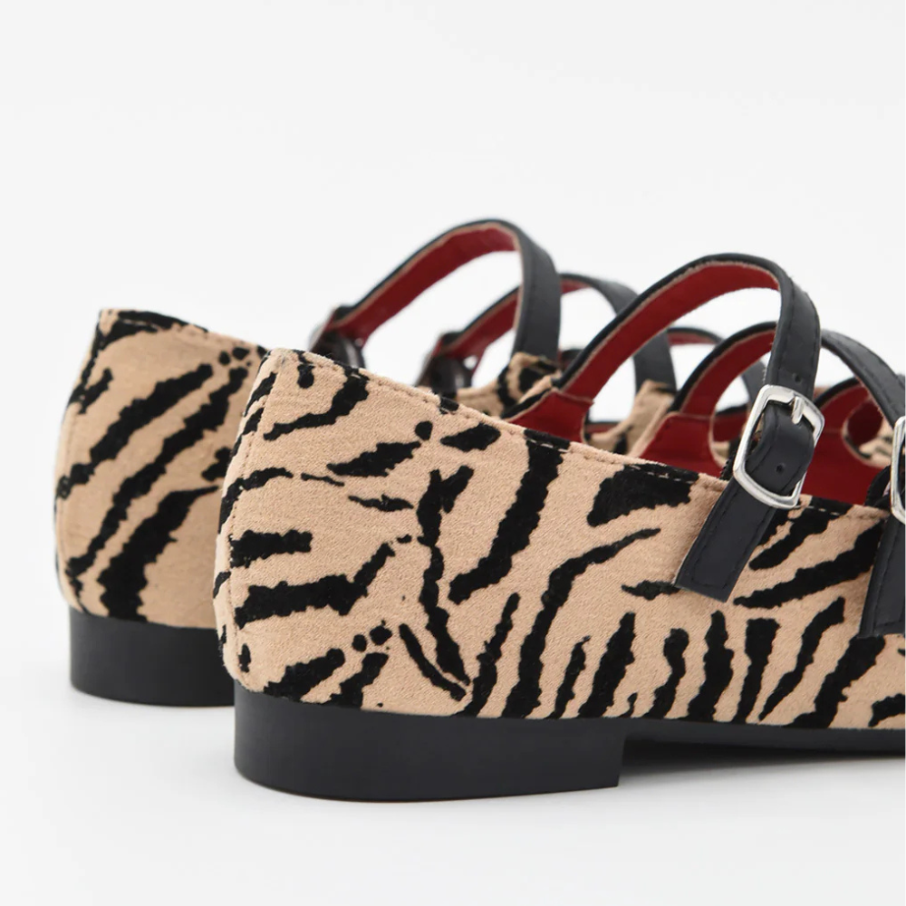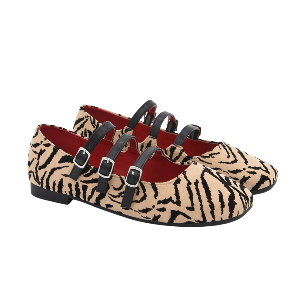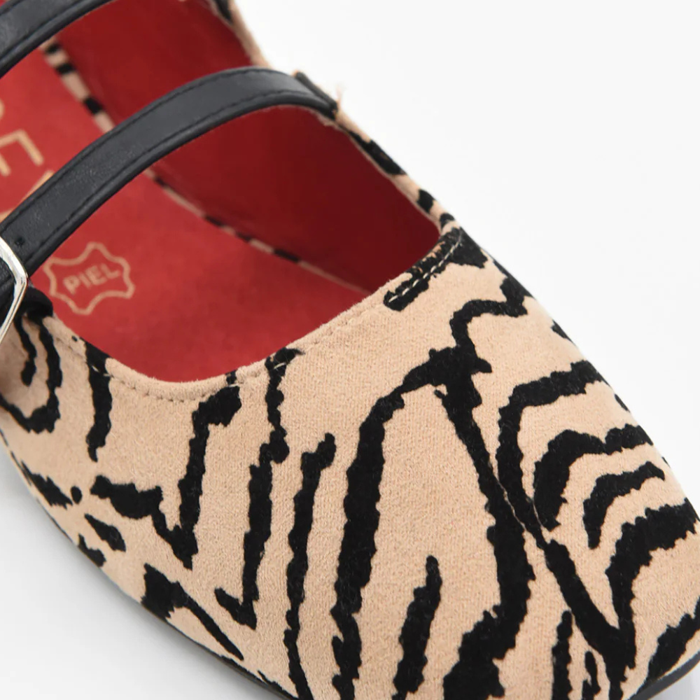 Bailarina de piel estampada en cebra color beige y negra con detalle de hebillas y plantilla de gel en piel roja. La combinación del estampado beige y negro, junto con su interior en rojo pasión, convierte a este modelo en una joya visual. Las correas de piel sujetan el pie con delicadeza, ofreciendo estilo sin renunciar a la comodidad. Perfectas para largas jornadas, escapadas urbanas o para elevar tu outfit de oficina con un toque inesperado.