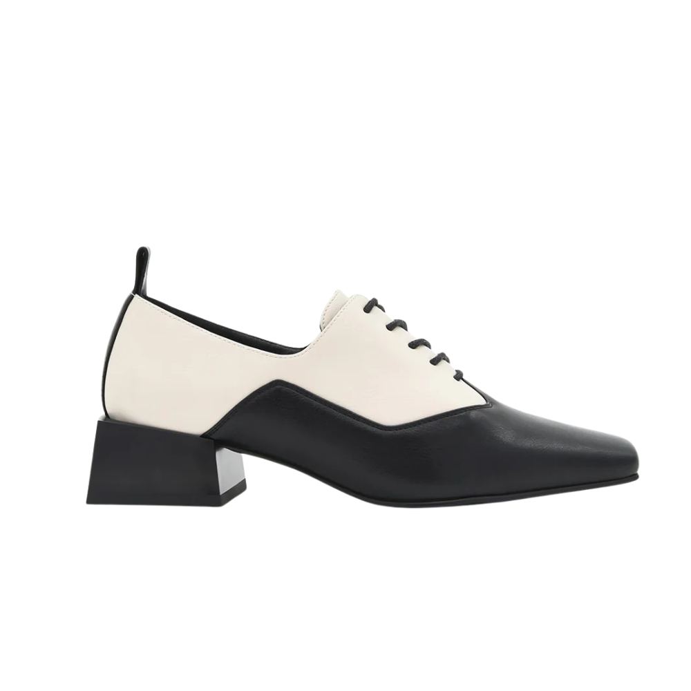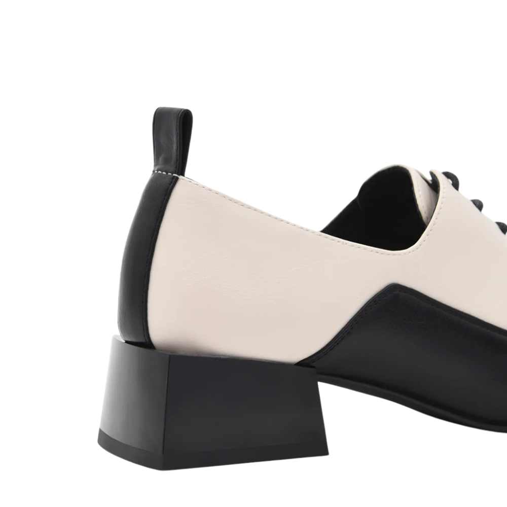 Zapato estilo mocasín masculino con cordón en blanco y negro. Tacón de 3,5cm y plantilla de gel especial confort. Un diseño atemporal y super favorecedor que le da un toque masculino a tus looks de oficina, de diario y hasta de fin de semana.