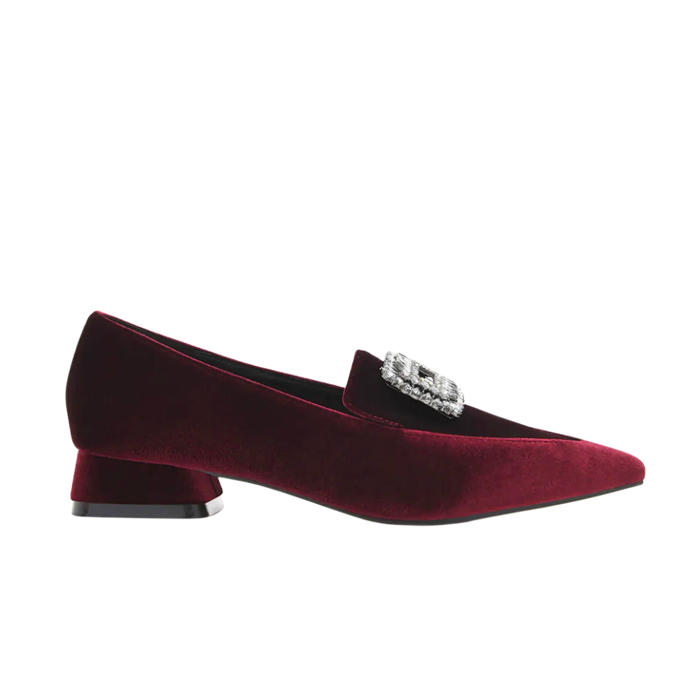 Zapato planito en terciopelo berenjena con detalle de pedrería en la parte delantera y tacón de 3,5cm. Plantilla de gel en piel especial confort y terminación en punta. Un diseño perfecto para tus noches y tus looks más arreglados.