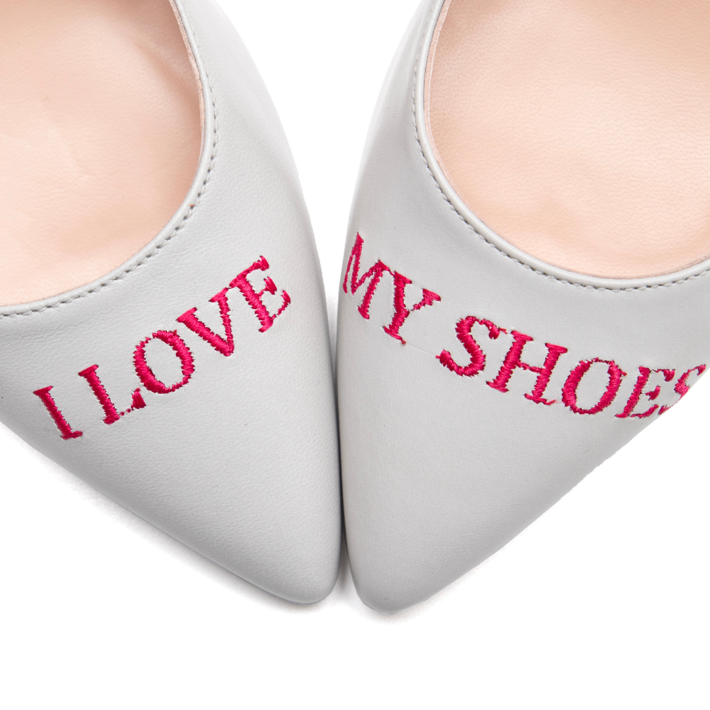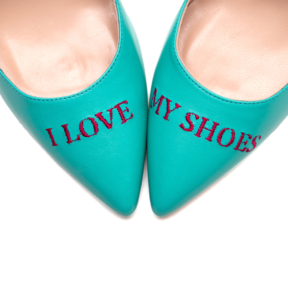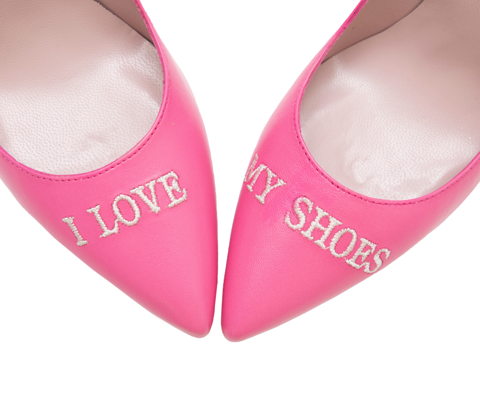 Stiletto de piel con mensaje bordado en hilo que pone: "I Love My Shoes". Un diseño de EDICIÓN LIMITADA fabricado para nuestra tienda. El zapato perfecto para lucir con tus looks de día o de noche. Tacón de 10cm y plantilla de gel especial confort. ¡No te quedes sin el TOP VENTAS de cada temporada! Combínalo con la cartera a juego también disponible en la web: "Cartera I love my shoes".