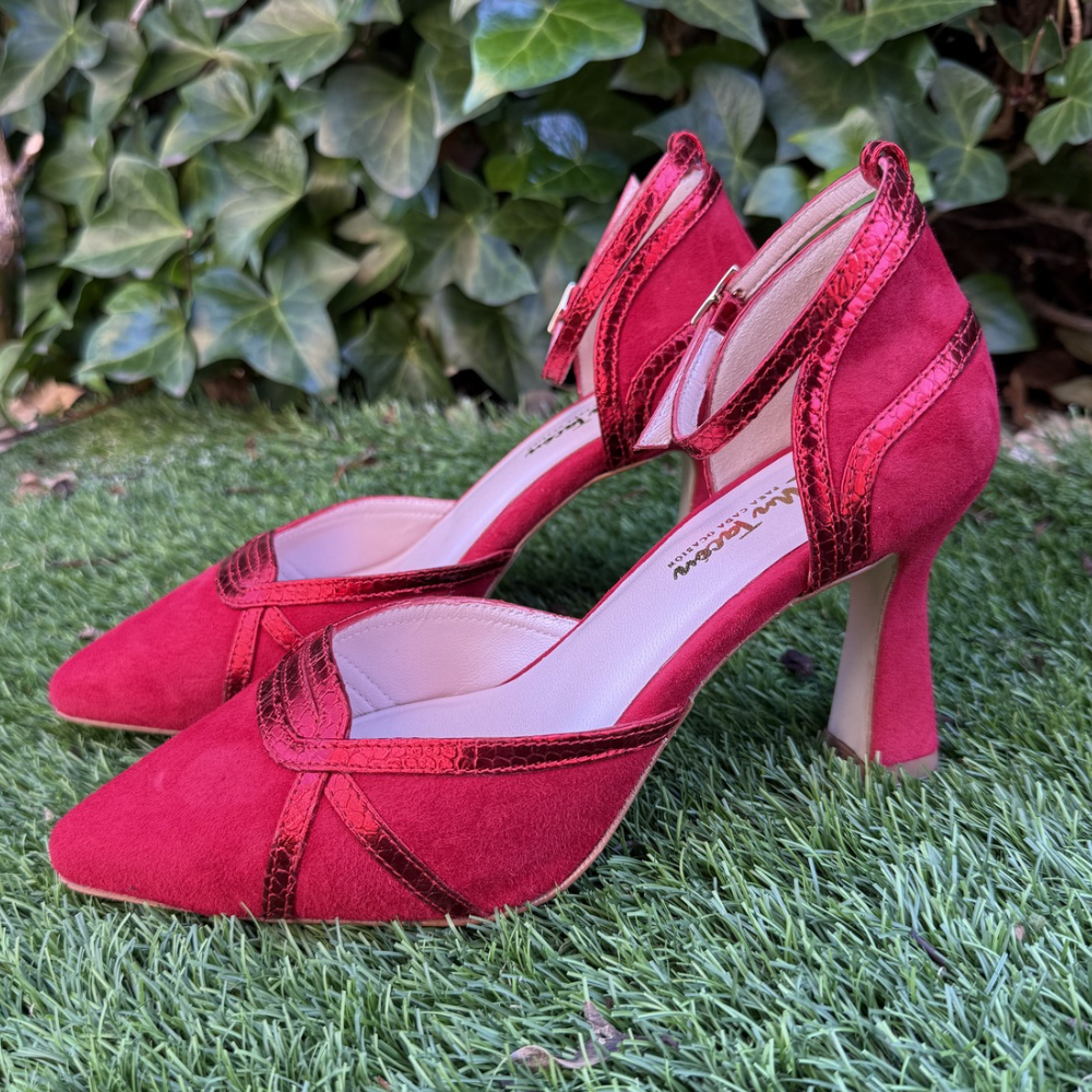 Zapato de piel rojo con pulsera al tobillo en combinación con metalizados estampados en print serpiente. Tacón de 9cm y plantilla de gel especial confort. Color: rojo Fabricado en Portugal Guía de tallas: Talla 36: 23cm Talla 37: 24,5cm Talla 38: 25cm Talla 39: 25,5cm Talla 40: 26,5cm Talla 41: 27cm