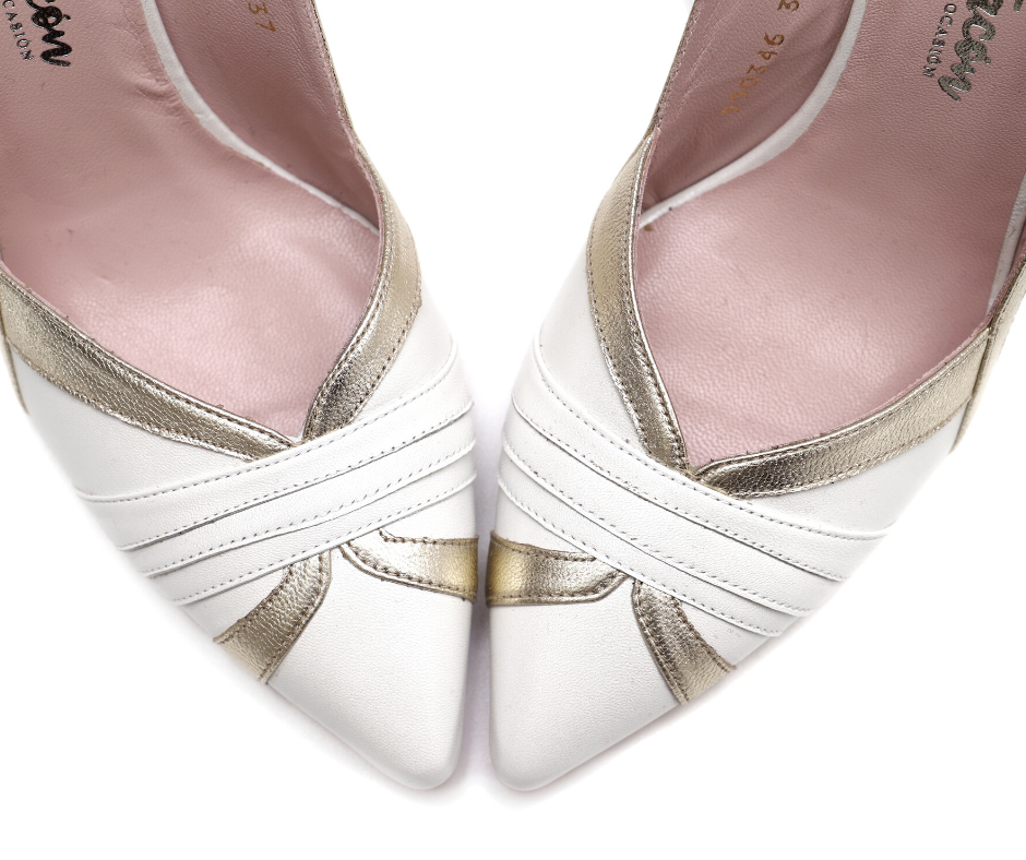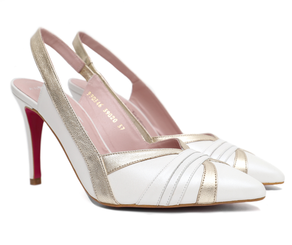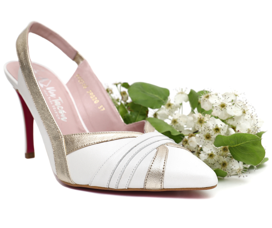 Zapato de tacón para novia. Tacón de 9cm, plantilla de gel especial confort y detalles en dorado para darle un toque de originalidad a tu día más especial. Destalonado y con un tono blanco perla perfecto para ser la novia ideal. Color: blanco 100% fabricado en España