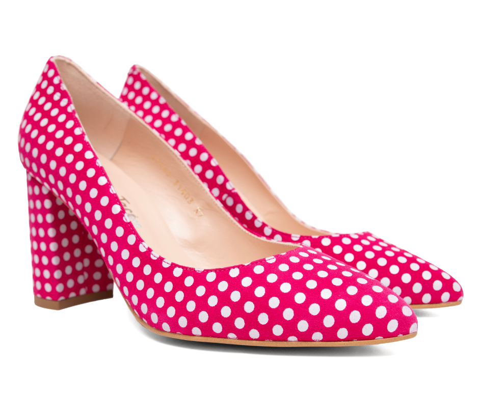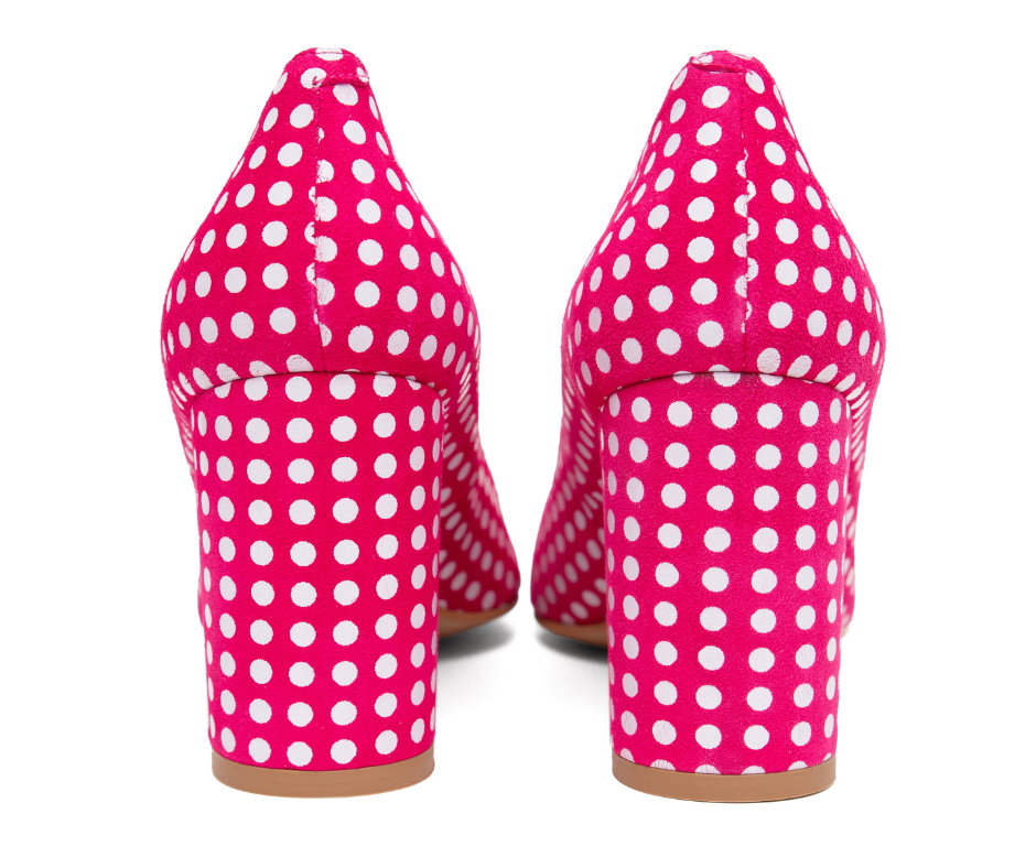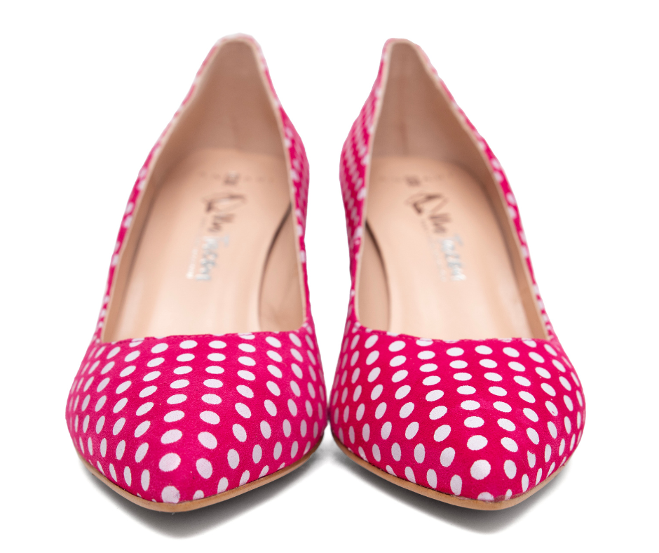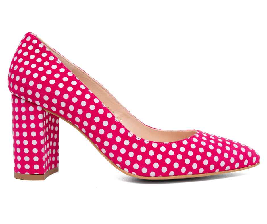 Zapato de piel en ante fucsia con lunar blanco de tacón anchito de 8cm y plantilla de gel especial confort. Este año ponle lunares a la Primavera y disfruta de zapatos cómodos, con estilazo y de diseño. Tienes también la versión en stiletto con tacón de 10cm si buscas un taconazo de lunares con el modelo "Stiletto Soleá" disponible en la web. ¡EDICIÓN LIMITADA!