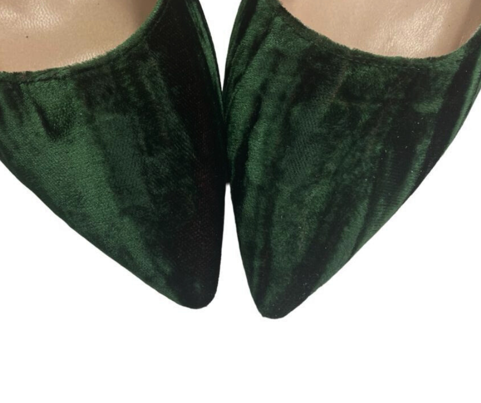 tiletto de piel en terciopelo verde con tacón de 10cm y plantilla de gel especial confort. Ideal para tus próximos eventos esta temporada,