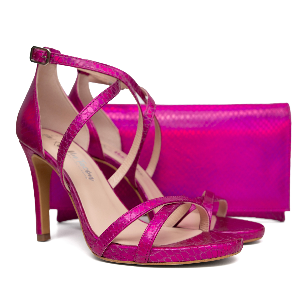 Sandalia de piel en tacón de 10cm con plataforma de 1,5cm y plantilla de gel especial confort. El diseño más rompedor combinando fucsia metalizado con el print efecto cocodrilo tan de tendencia esta temporada. ¡Bailateló todo!