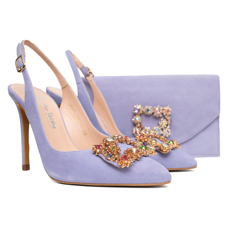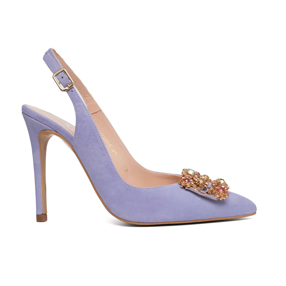 Stiletto de piel en ante lila con detalle de adorno de pedrería multicolor en la parte delantera. Tacón de 10cm y plantilla de gel especial confort. Te hará sentir como una auténtica princesa de cuento. Si buscas la versión en planito también puedes ver nuestro "Zapato Amalia" en la web. Combínalos con nuestro "Bolso Amalia" y crea tu conjunto de 10.