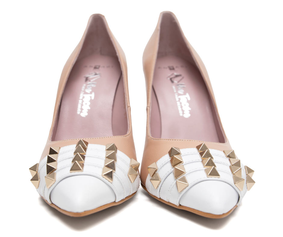 Stiletto de piel en tono beige y con puntera blanca con detalle de tachuelas doradas. Una tendencia muy aplaudida este año la de las tachas y que le dará ese toque cañero a tus looks. Tacón de 10cm y plantilla de gel especial confort. Color: beige Fabricado en España Guía de tallas: Talla 36: 23cm Talla 37: 24,5cm Talla 38: 25cm Talla 39: 25,5cm Talla 40: 26,5cm Talla 41: 27cm