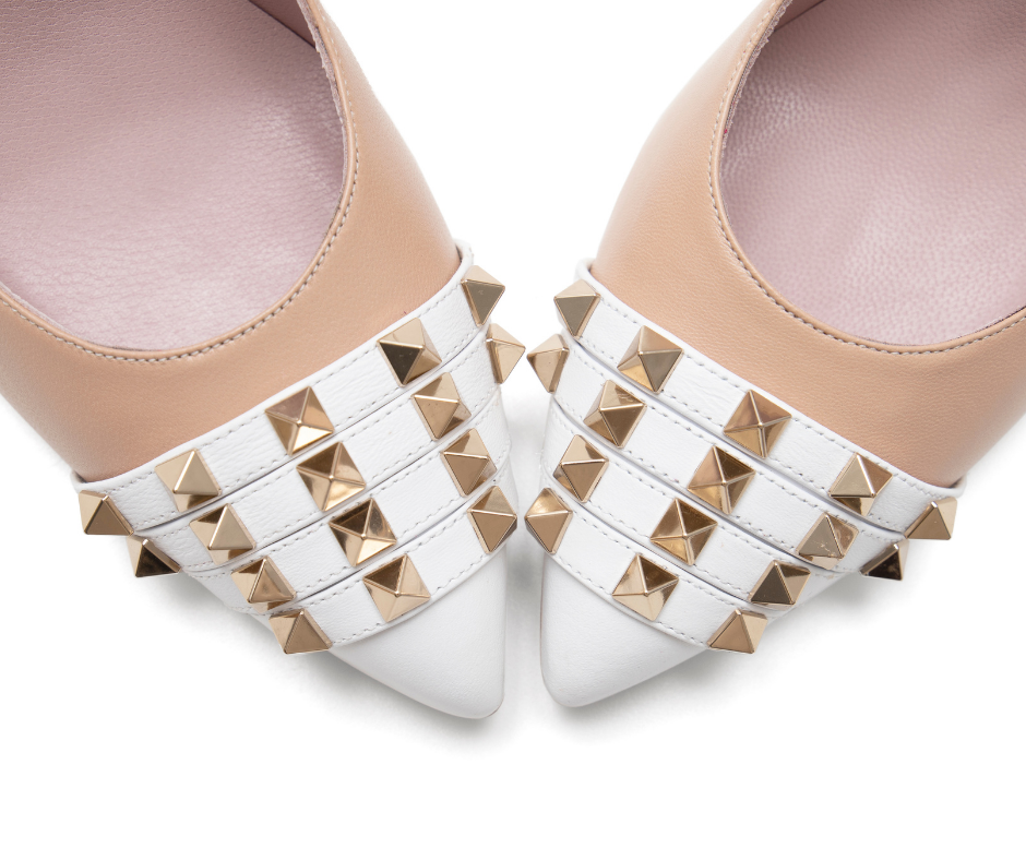 Stiletto de piel en tono beige y con puntera blanca con detalle de tachuelas doradas. Una tendencia muy aplaudida este año la de las tachas y que le dará ese toque cañero a tus looks. Tacón de 10cm y plantilla de gel especial confort.